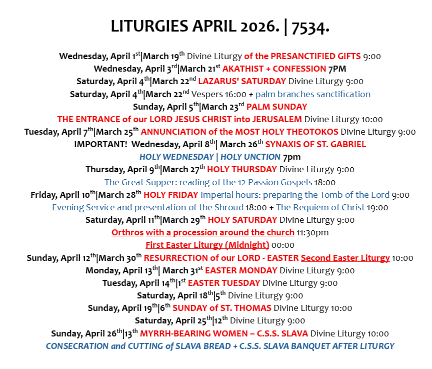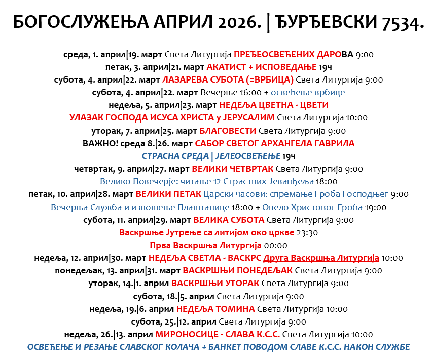 Распоред богослужења Liturgy schedule Света Литургија недељом почиње у 10 часова.Суботом и свим осталим данима и/или Празницима почиње у 9 часова. Црква Свети СаваИсторијат цркве „Свети Сава“ Свештеници Богослужења Ктитори Управа Црквено-школске општине Kоло српских сестара Прилози Волонтери Хуманитарни рад Изнајмљивање сале